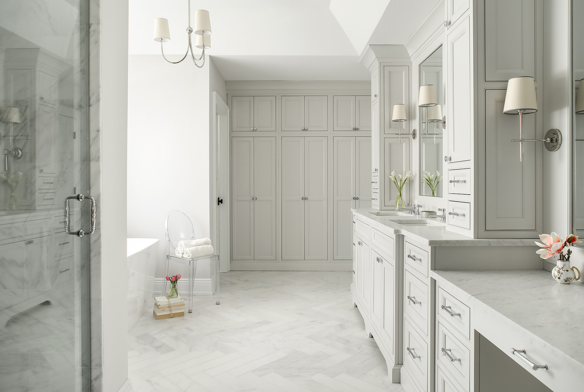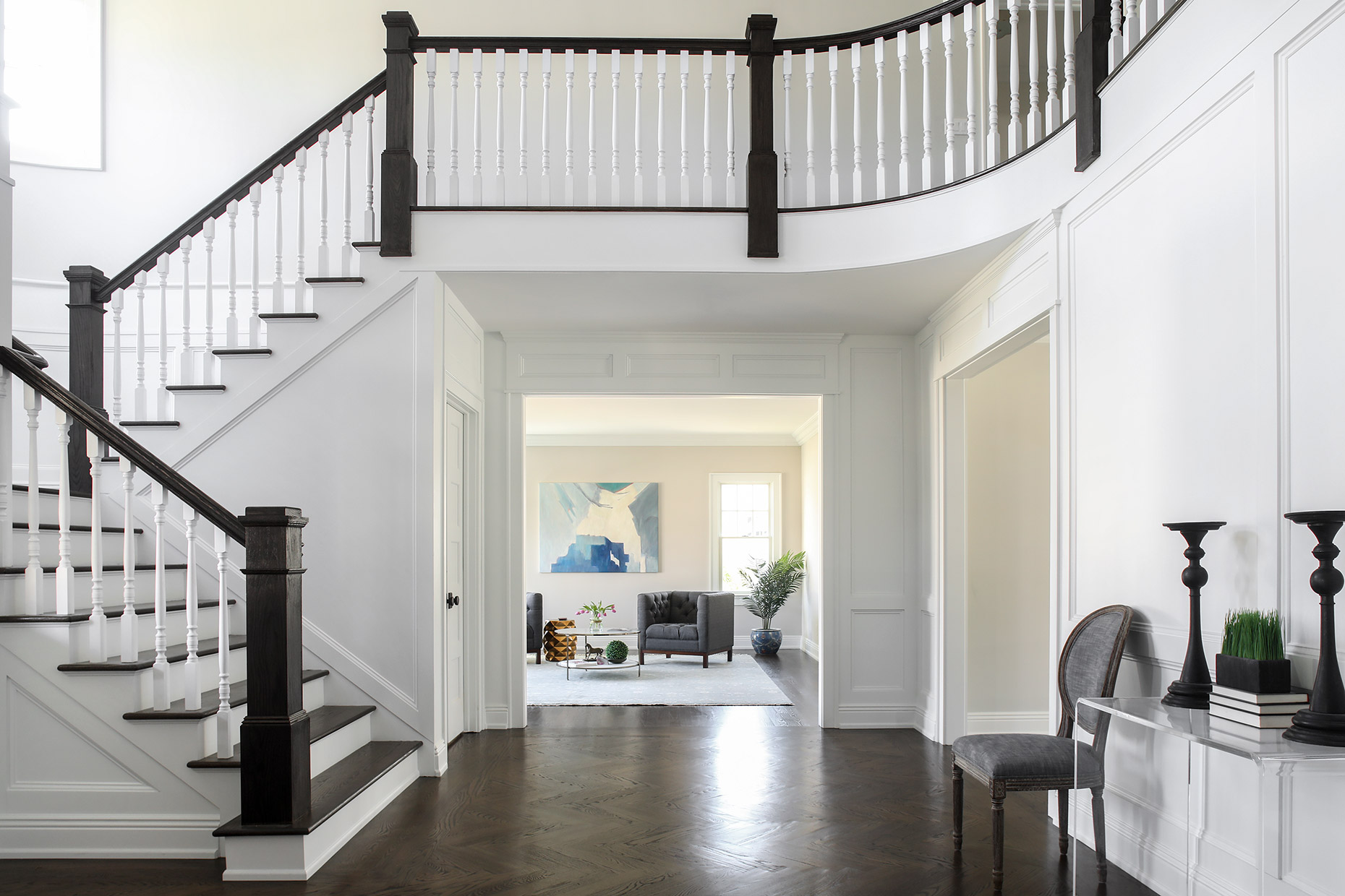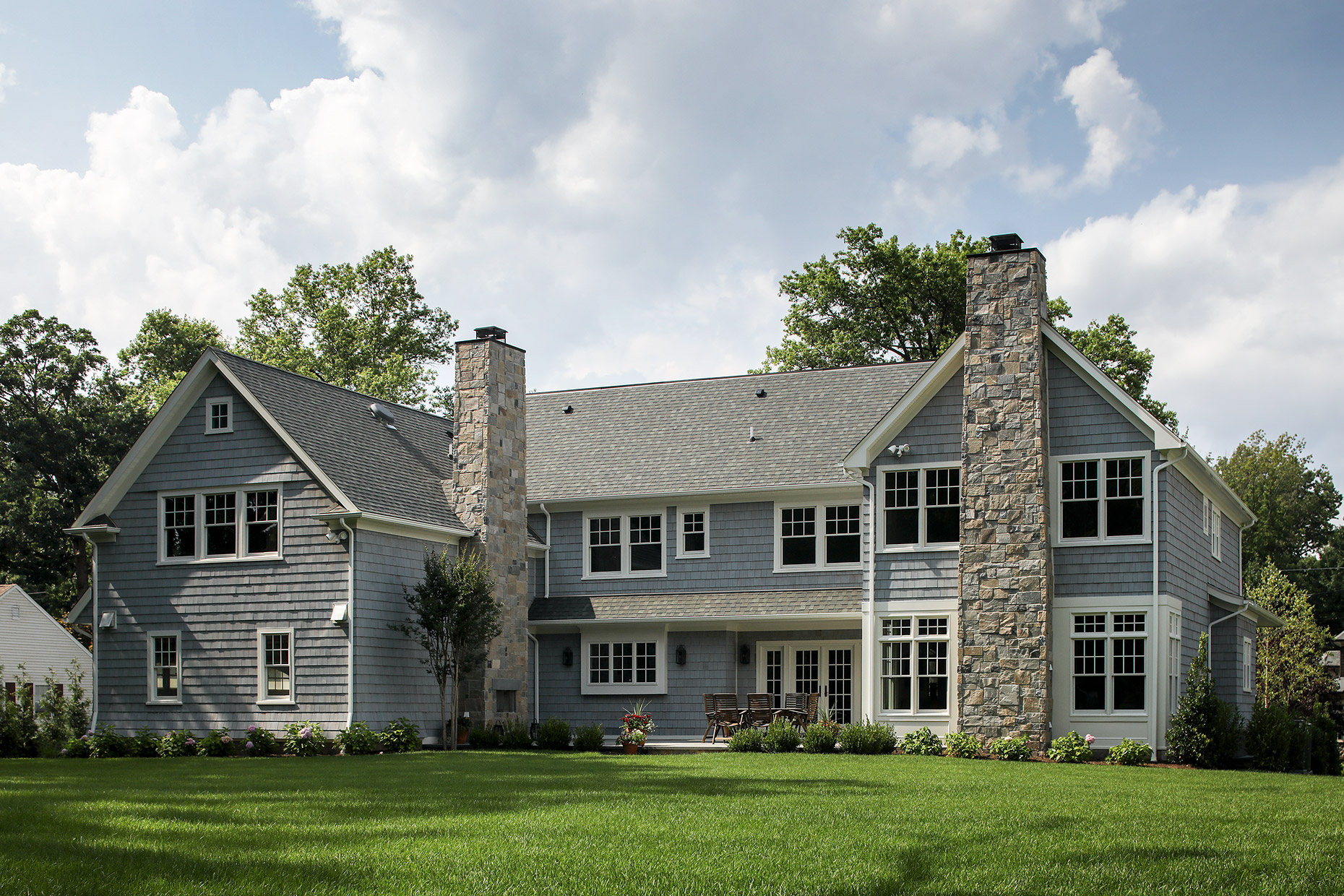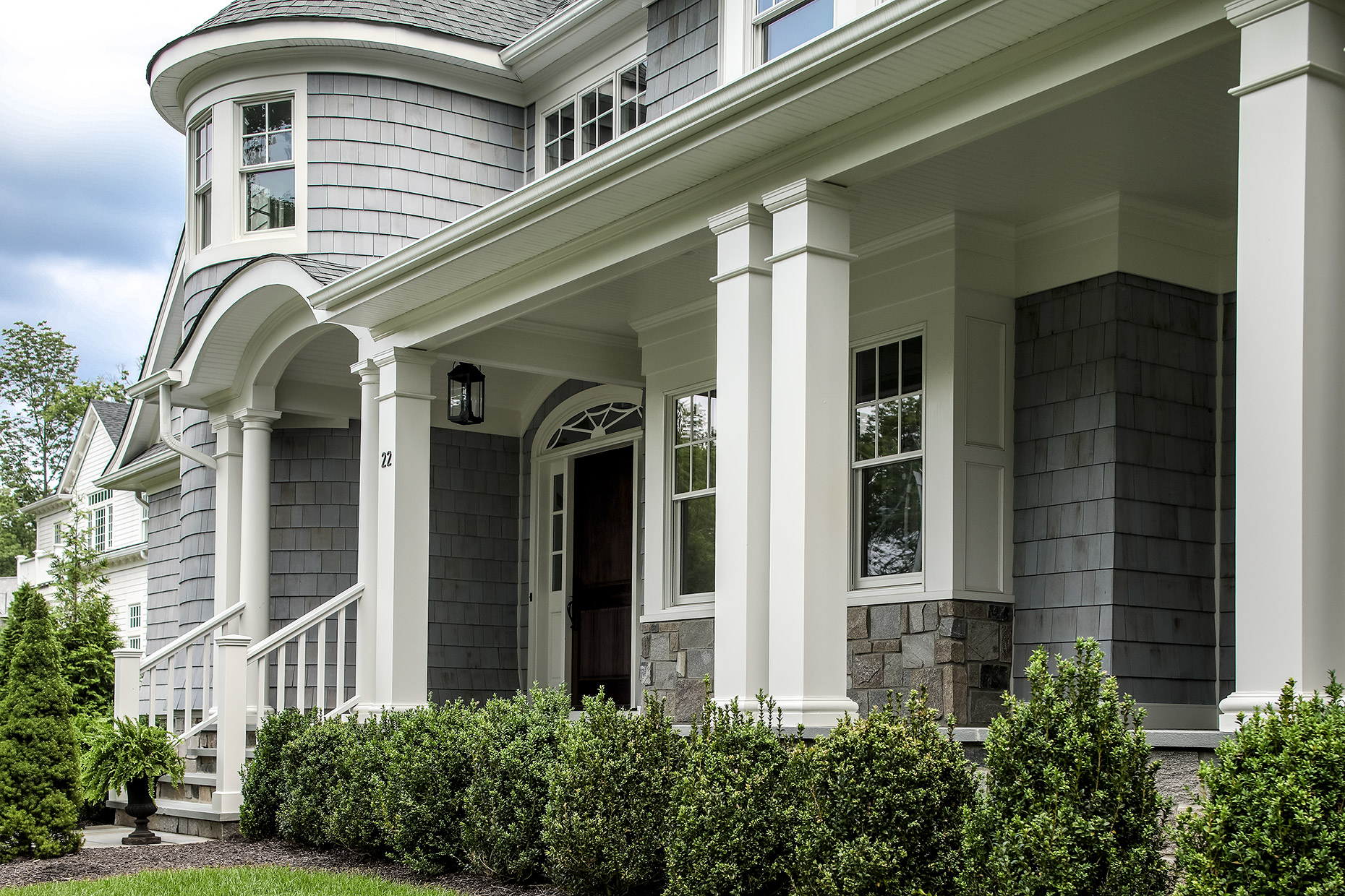 This classic gray shingle-style home is defined by its architectural presence, featuring a traditional covered porch and a prominent two-and-a-half-story turret. A masterwork of design and execution, architect Danial Dubinett and Moore Fine Homes achieved a perfect harmony of grand scale and residential comfort within this seven-bedroom, six-and-a-half-bath residence. The interior narrative, curated by designer Lara Allen-Brett Design, brings the home's sophisticated exterior warmth inward through the use of intricate custom millwork, hand-selected marble and tile, and unique artisanal selections throughout every space.