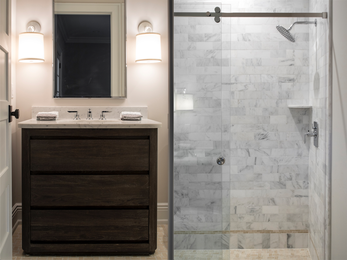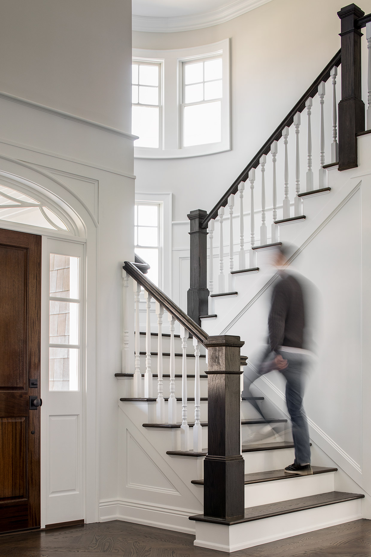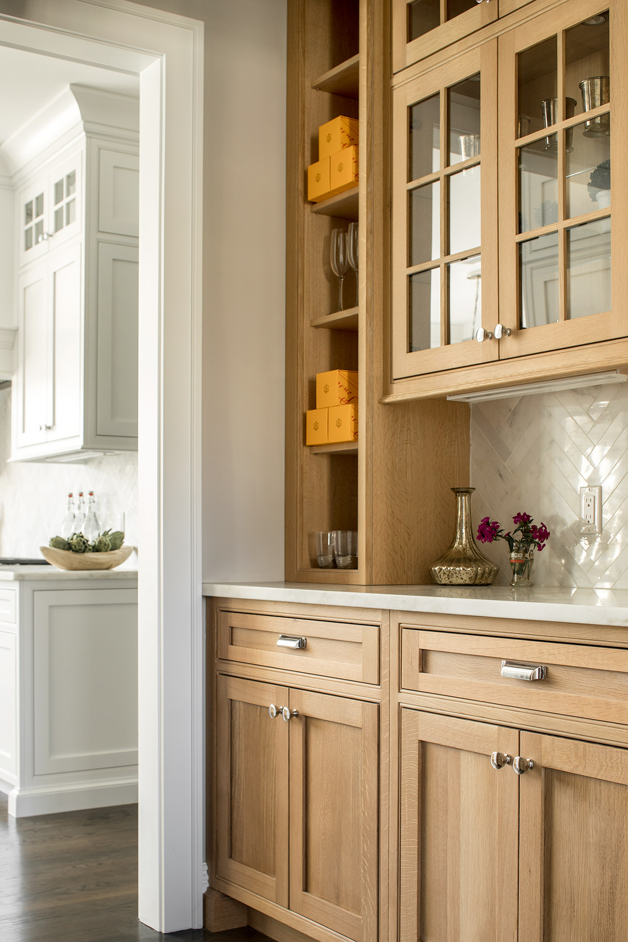 This classic gray shingle-style home is defined by its architectural presence, featuring a traditional covered porch and a prominent two-and-a-half-story turret. A masterwork of design and execution, architect Danial Dubinett and Moore Fine Homes achieved a perfect harmony of grand scale and residential comfort within this seven-bedroom, six-and-a-half-bath residence. The interior narrative, curated by designer Lara Allen-Brett Design, brings the home's sophisticated exterior warmth inward through the use of intricate custom millwork, hand-selected marble and tile, and unique artisanal selections throughout every space.