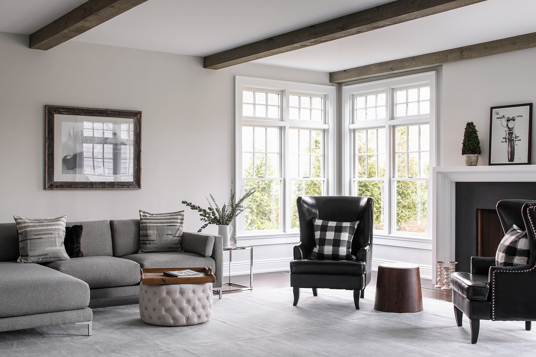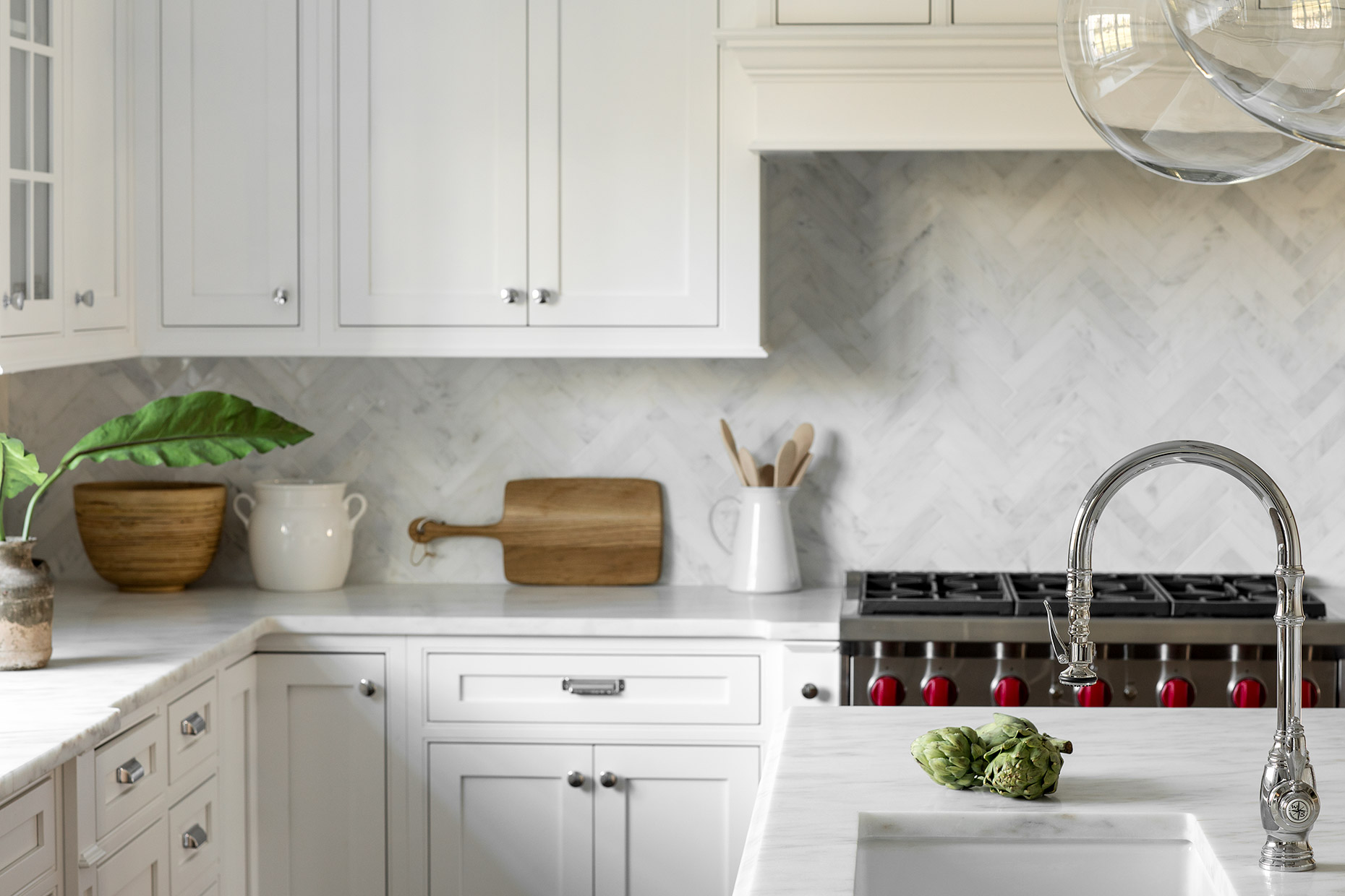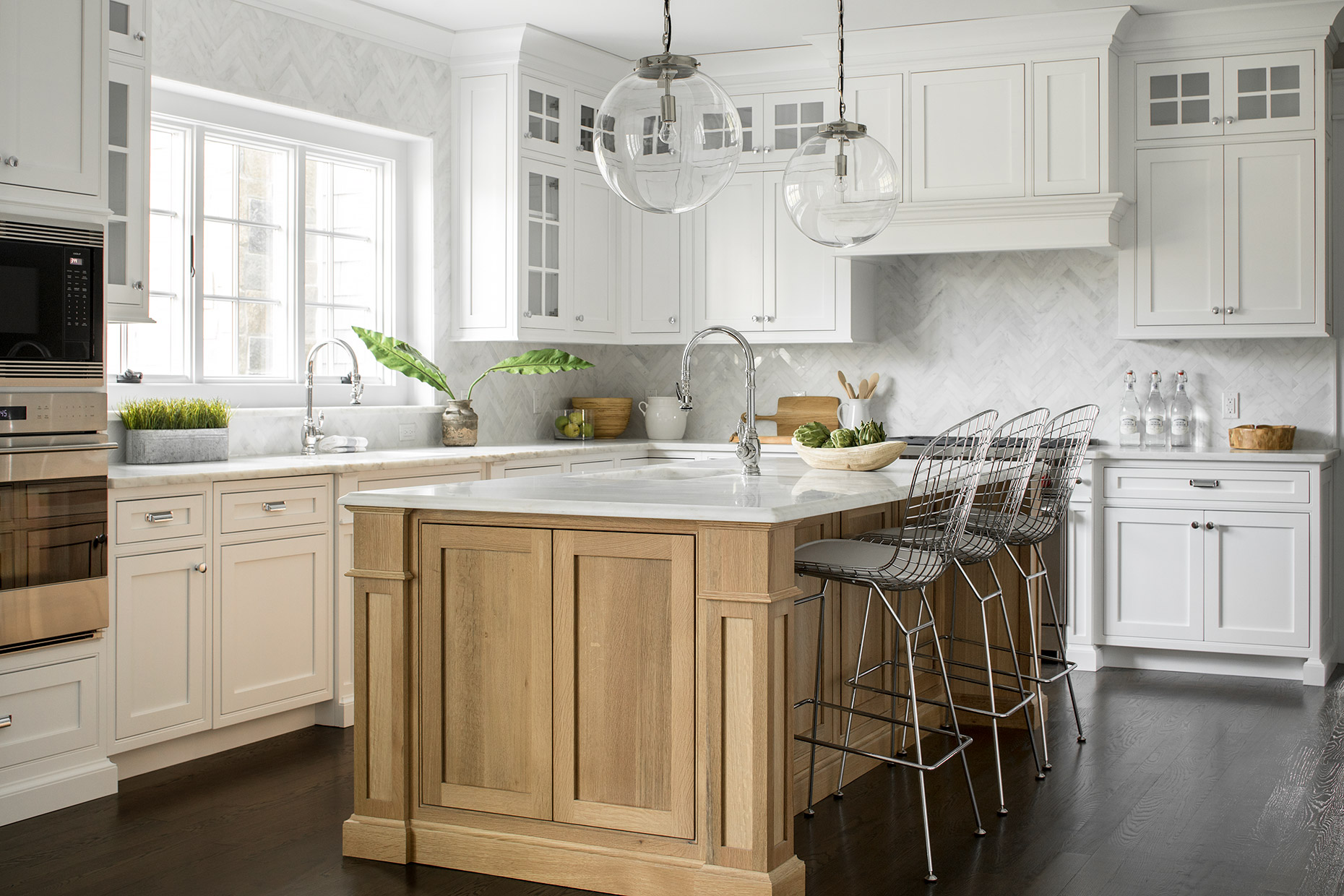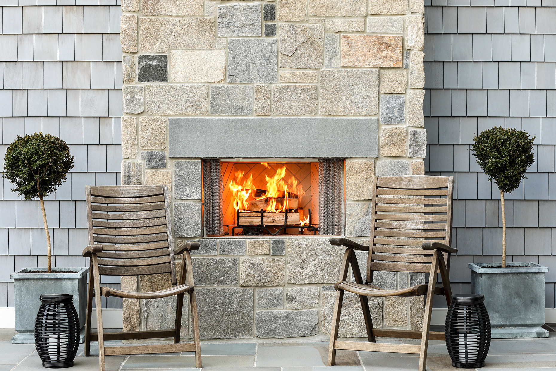 This classic gray shingle-style home is defined by its architectural presence, featuring a traditional covered porch and a prominent two-and-a-half-story turret. A masterwork of design and execution, architect Danial Dubinett and Moore Fine Homes achieved a perfect harmony of grand scale and residential comfort within this seven-bedroom, six-and-a-half-bath residence. The interior narrative, curated by designer Lara Allen-Brett Design, brings the home's sophisticated exterior warmth inward through the use of intricate custom millwork, hand-selected marble and tile, and unique artisanal selections throughout every space.
